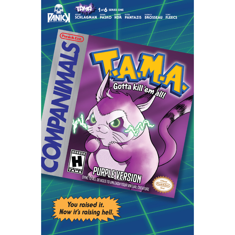 2ND PRINTING! THE VIRTUAL PET THAT WANTS TO KILL ‘EM ALL! PANICK ENTERTAINMENT unleashes its debut title T.A.M.A.. We all had ‘em—virtual pets like Tamagotchis, NeoPets, and Digimon. But what if, after years of neglect, one returned… for revenge? When a grieving, lonely teen stumbles upon an old virtual pet system, he finds comfort. But when gruesome deaths begin to follow, he wonders—could his digital companion be responsible? T.A.M.A. mixes the nostalgia of virtual pets with the generational phenomenon of Pokémon. Interior art by Daniel HDR (Masters of the Universe), Special Cover A TAMA Trading Card Homage Cover by Jim Fletcher